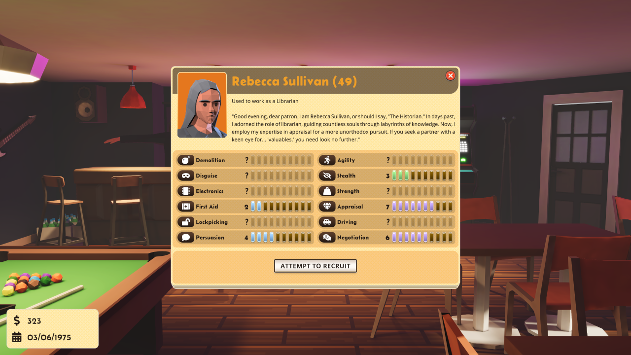 👥 Recruit your crew: Recruit a diverse team of specialists from the smoky corners of the friendly neighbourhood pub. Each member brings unique skills: lockpicking, disguise, electronics, demolition, stealth, and more.